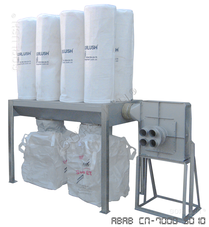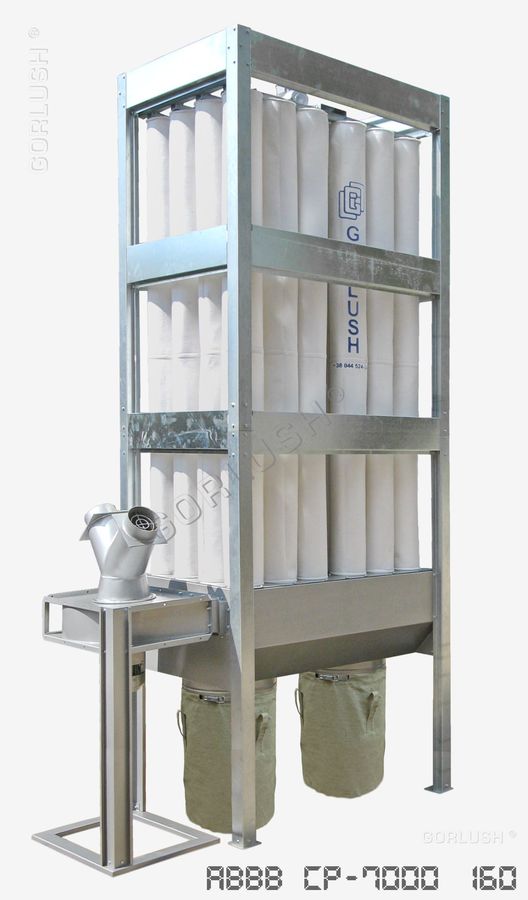 Аспирационная установка СР - 7000 (фильтры в виде рукавов из материала, соответствующего свойствам удаляемой пыли). Рукавные аспирационные установки средней производительности эксплуатируют в основном со шлифовальным оборудованием большой мощности. Специализация - отделение пыли, но они так же эффективно отделяют и стружку. Рукавные фильтра позволяют проводить регенерацию и периодическую очистку фильтровального блока, что обусловило развитие и широкое распространение рукавного фильтровального оборудования.