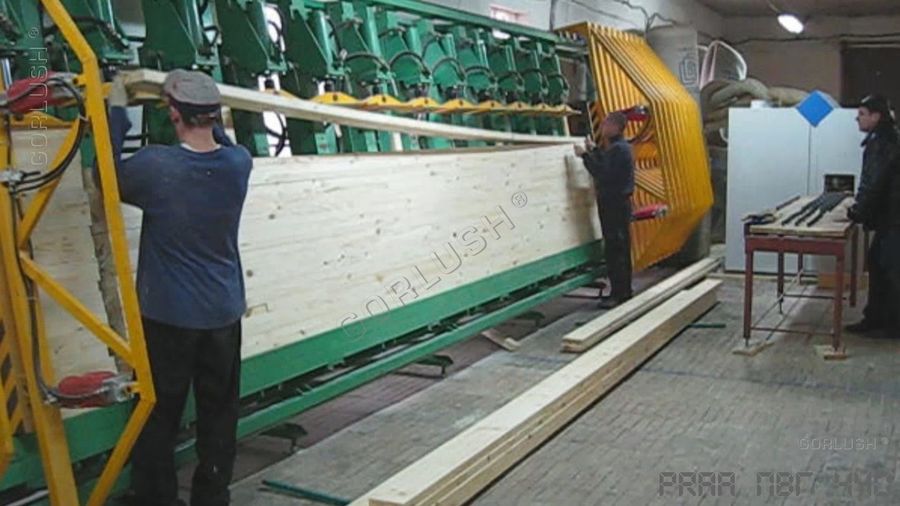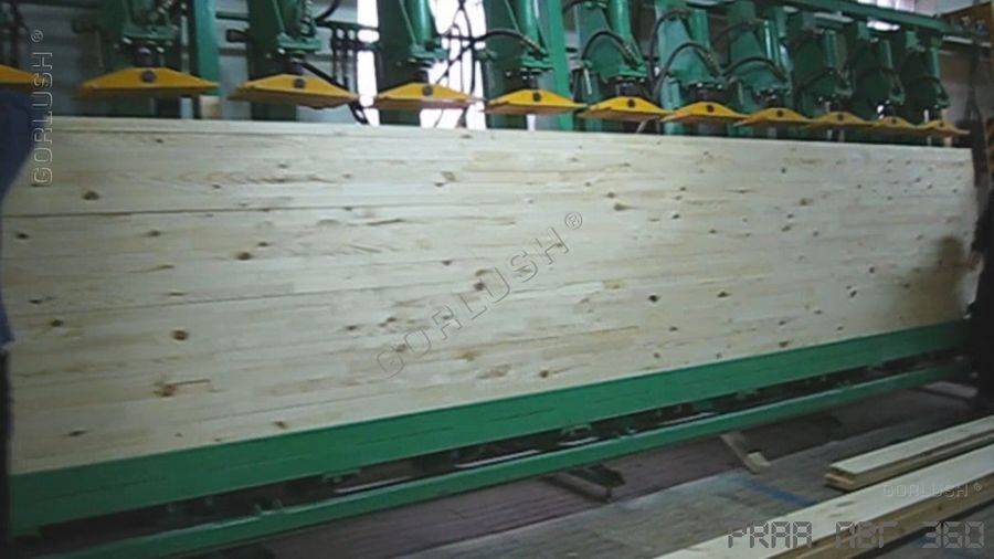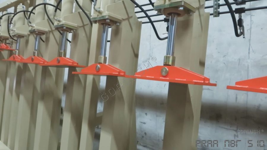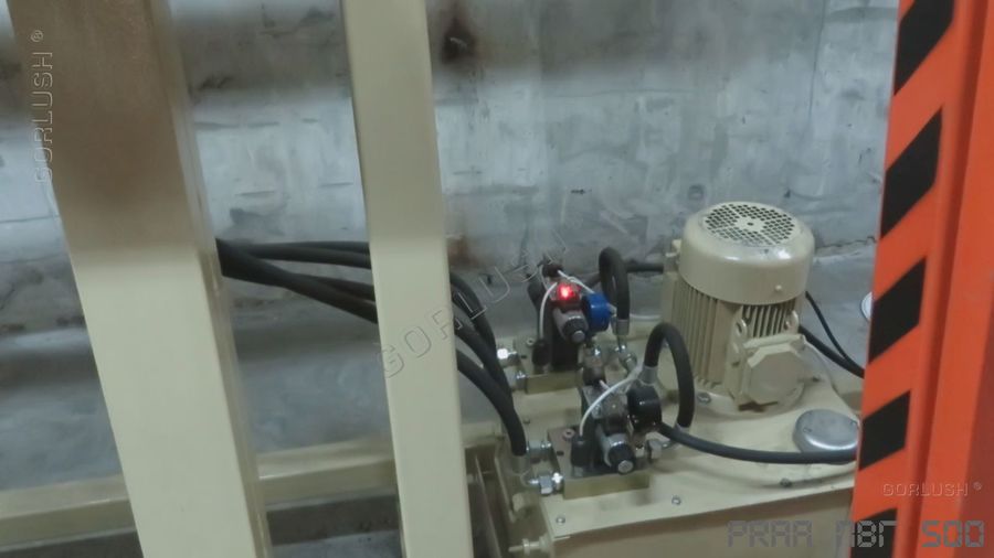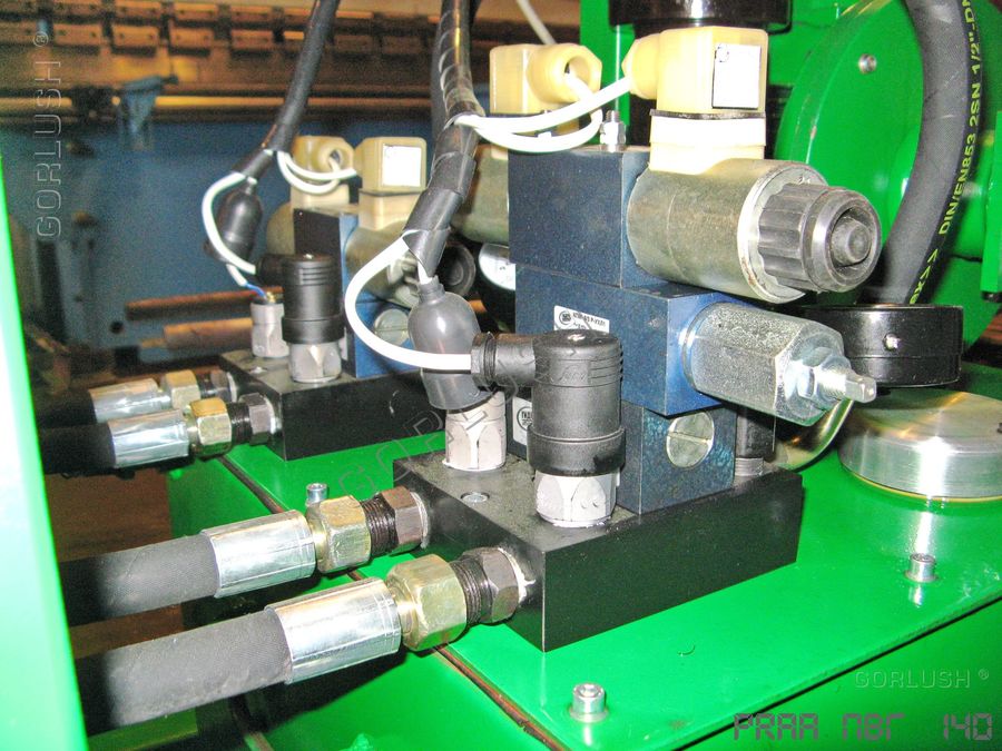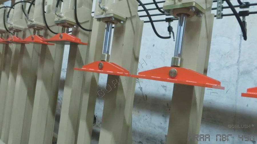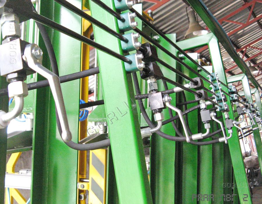 - гидрозамков на каждом силовом гидроцилиндре, которые позволяют, при необходимости, вести прессование на длине от 800 до 3200 мм на любой из автономно работающих секций или длиной от 3200 до 6400 мм по всей длине пресса. Количество независимых участков прессования может достигать 12 шт;